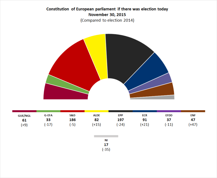 Die Parteien, die sich unter dem Dach der rechtspopulistischen ENF-Fraktion zusammengefunden haben verharren wie schon im Vormonat Oktober bei durchschnittlich sechs Prozent europaweit. Zwar kann Marine Le Pens Front National als Teil der ENF-Fraktion in einigen Regionen Frankreichs ebenso wie die ENF-Partei Lega Nord in Italien leicht zulegen, dafür verliert die ENF in anderen Regionen Europas wie in Österreich oder in den Niederlanden in der Zeit nach den Anschlägen an Wählerstimmen.